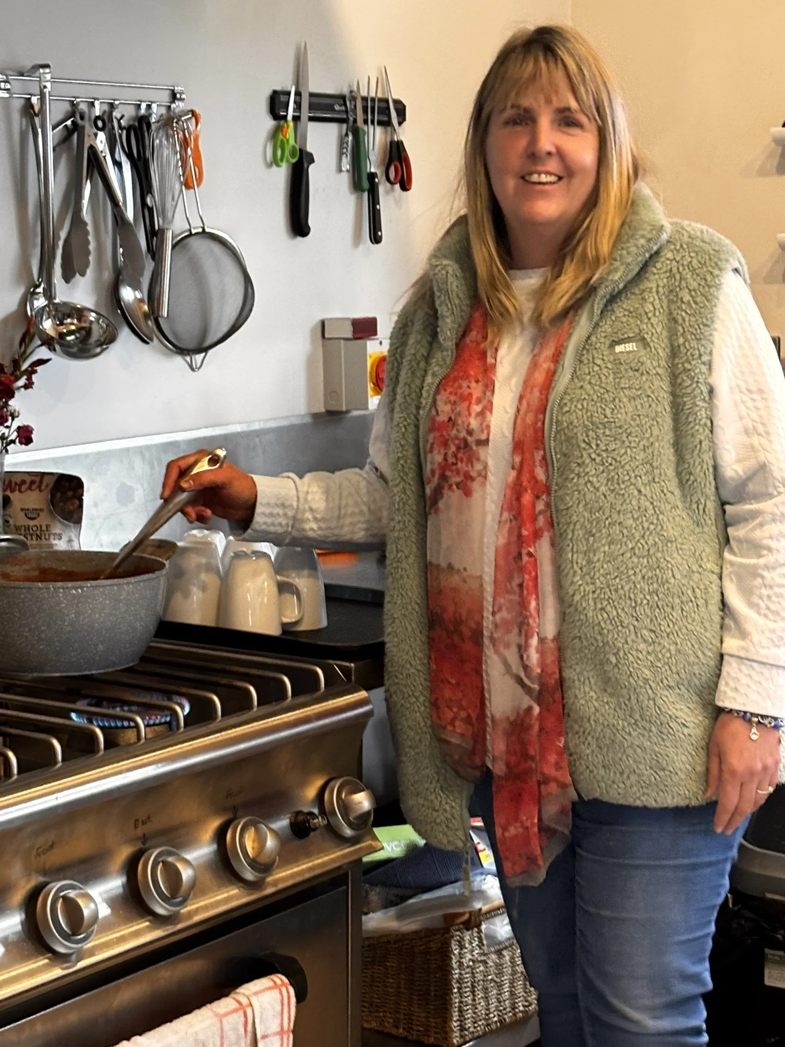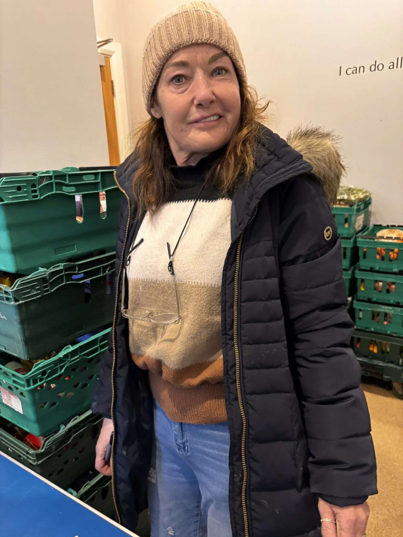 Let me share. The pictures are of our volunteers on October 14th, 2025. Mark was looking after the warehouse. Sean and Sandra were helping the guests choose their food. Debbie and Bernadette were offering soup & bread, stewed apple & crumble mix, a variety of fruit salad, grapes, pringles and biscuits. Coffee & Tea were available too and each week the community grows.